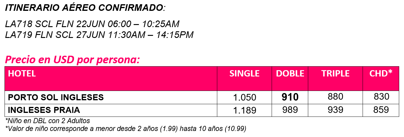 - Pasajes aéreos Santiago-Florianópolis -Santiago en vuelo LATAM Tarifa Light. (Incluye 1 mochila y 1 equipaje de cabina 10 kilos).