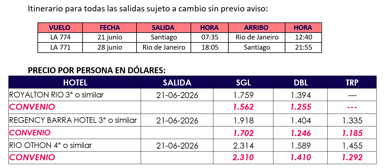 Precio venta CONVENIO: USD 1.255 (Por persona en ocupación doble.)