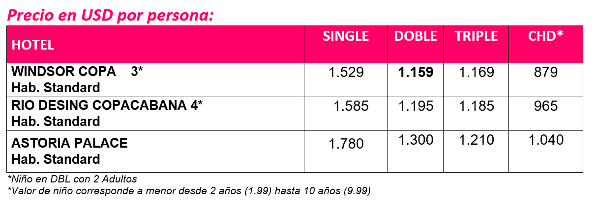 - 7 noches de alojamiento en RIO DE JANEIRO Hotel seleccionado DESAYUNO.