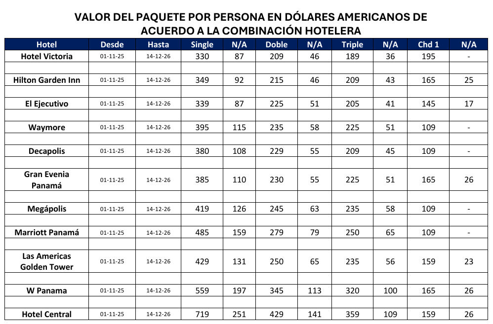 • 2 noches de Alojamiento en Ciudad de Panamá Hotel a elección.