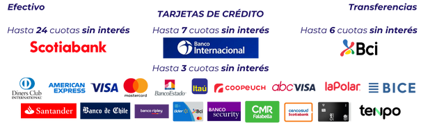 Los medios de pagos que Ud. puede utilizar con nosotros, son informados conjuntamente con los servicios ofrecidos por los proveedores de los servicios turísticos. Siempre en forma previa a su solicitud de compra o reserva, al momento de llegar a la pasarela de pago. Cuando el consumidor ingresa los datos de su cuenta o tarjeta y acepta la operación, con ello autoriza el cargo por precio y/o tarifa, y el pago del cargo por nuestro servicio. Si Ud. efectúa una compra en cuotas mediante una tarjeta de crédito, tenga presente que los intereses, impuestos, comisiones u otros cargos que pudieran generar las compras en cuotas mediante tarjetas de crédito, dependerán de las condiciones que el consumidor haya pactado con cada banco o emisor de tarjeta. Le recomendamos informarse de las condiciones de uso y de interés de su tarjeta de crédito antes de utilizar modalidad de compra en cuotas.